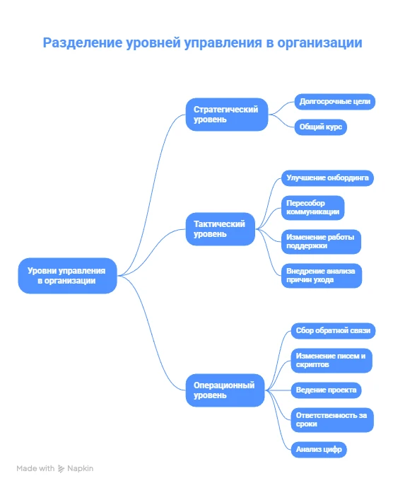 Допустим, бизнес хочет сократить отток клиентов. Это цель верхнего уровня. Тактический уровень в таком случае отвечает за выбор направлений работы: улучшить онбординг, пересобрать коммуникацию после покупки, изменить подход к поддержке, наладить регулярный анализ причин ухода.