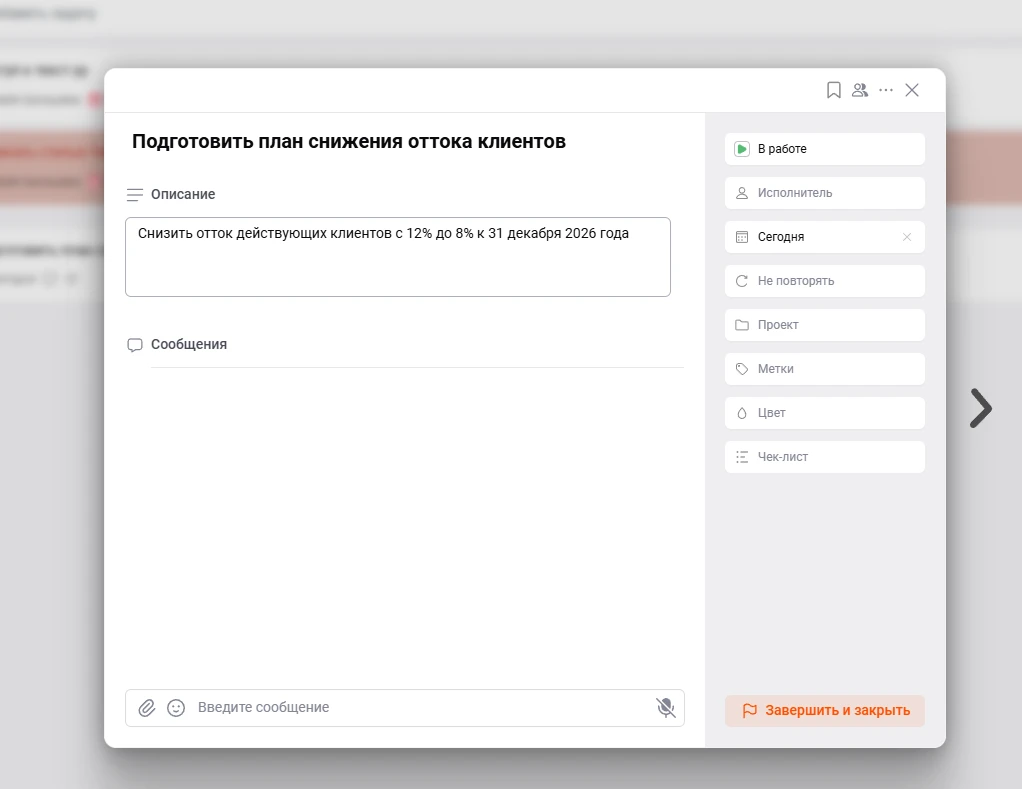 - Не «улучшить сервис», а «снизить отток клиентов с 12% до 8% к концу года».
