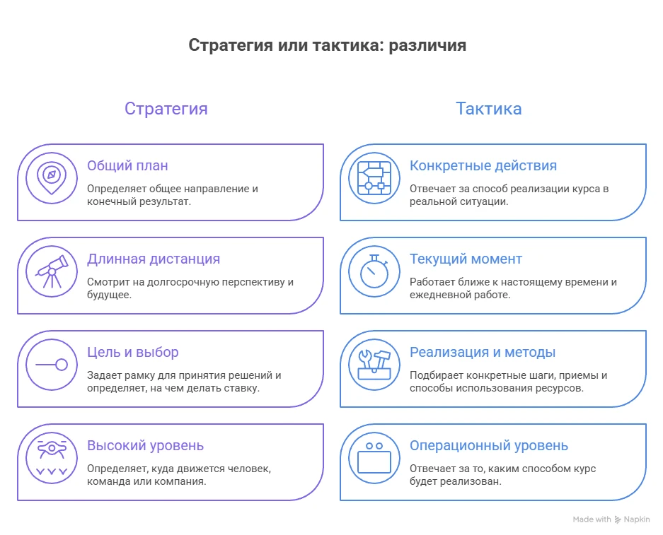 Здесь появляется тема тактики и стратегии. Это рабочая оптика, без которой сложно управлять ресурсами, временем, людьми и приоритетами. Общий курс нужен, чтобы задать направление. Тактика нужна, чтобы пройти ближайший участок пути. Одно без другого работает плохо.