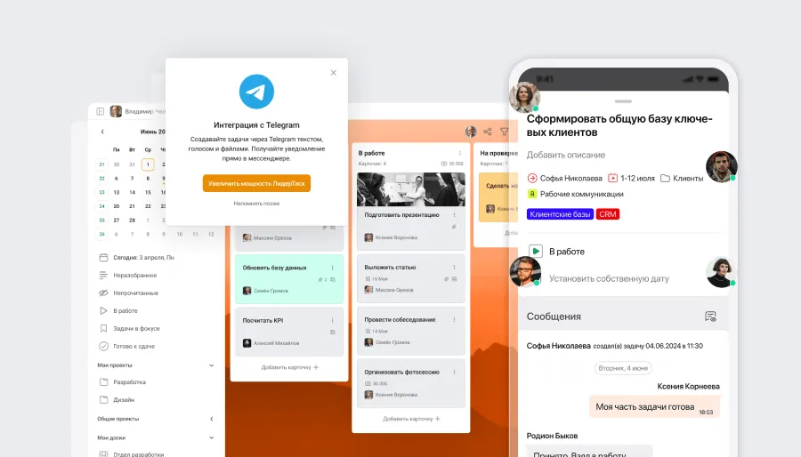 ЛидерТаск позволяет ставить поручения коллегам и отслеживать их выполнение. Вы всегда в курсе, кто над чем работает, без необходимости лично уточнять статус задач.