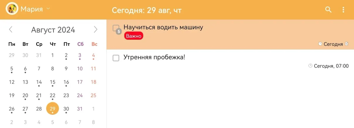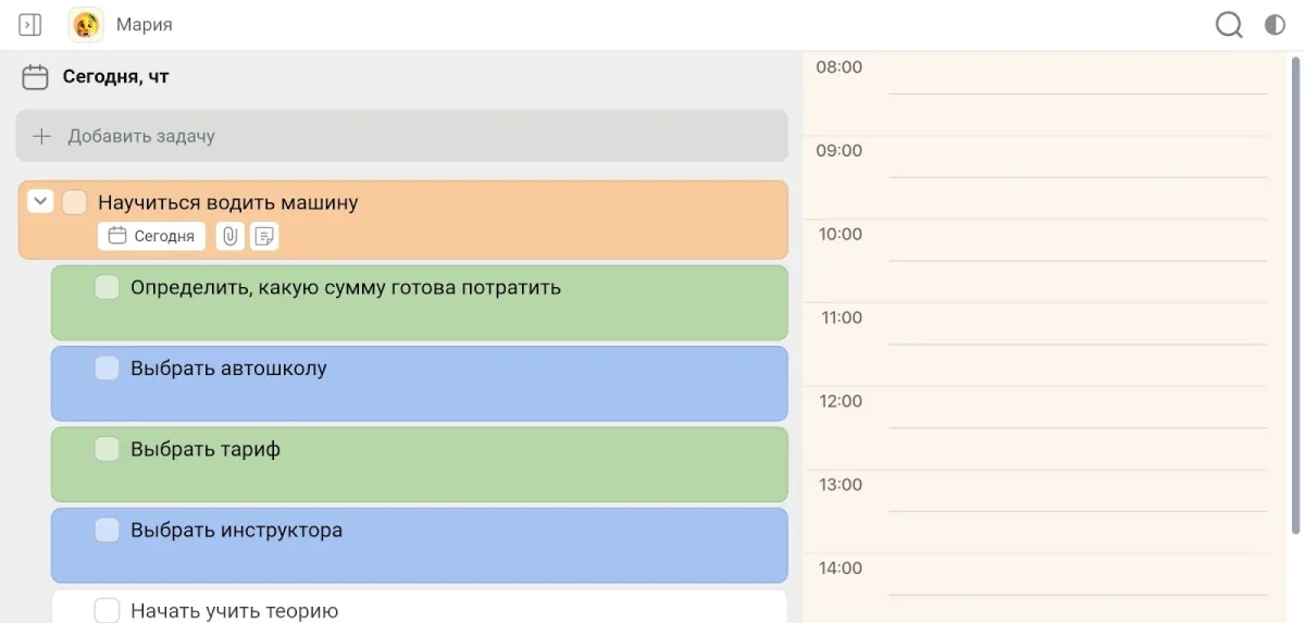 Для каждой задачи и подзадачи вы можете установить дату и время, а также — напоминание. Так легко будет не забыть, например, о ежедневной пробежке или занятии английским.