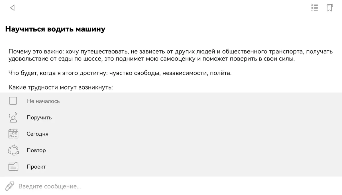 В главной задаче напишите свою большую цель. Вы можете подробно расписать её в описании, добавить вдохновляющие картинки, музыку, файлы — всё, что поможет визуализировать цель. А в подзадачах опишите маленькие шаги, которые будете выполнять каждый день, чтобы достигнуть цели.