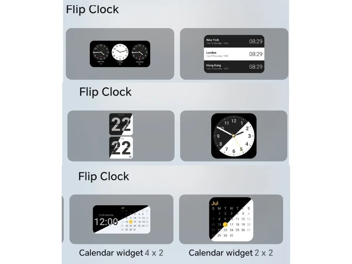 Одиннадцать вариантов виджета — мировые часы до 4 штук на экране, табло с перелистыванием времени — вертикальное и горизонтальное. Также есть часы со стрелками, отображение времени с календарем и просто календарь.