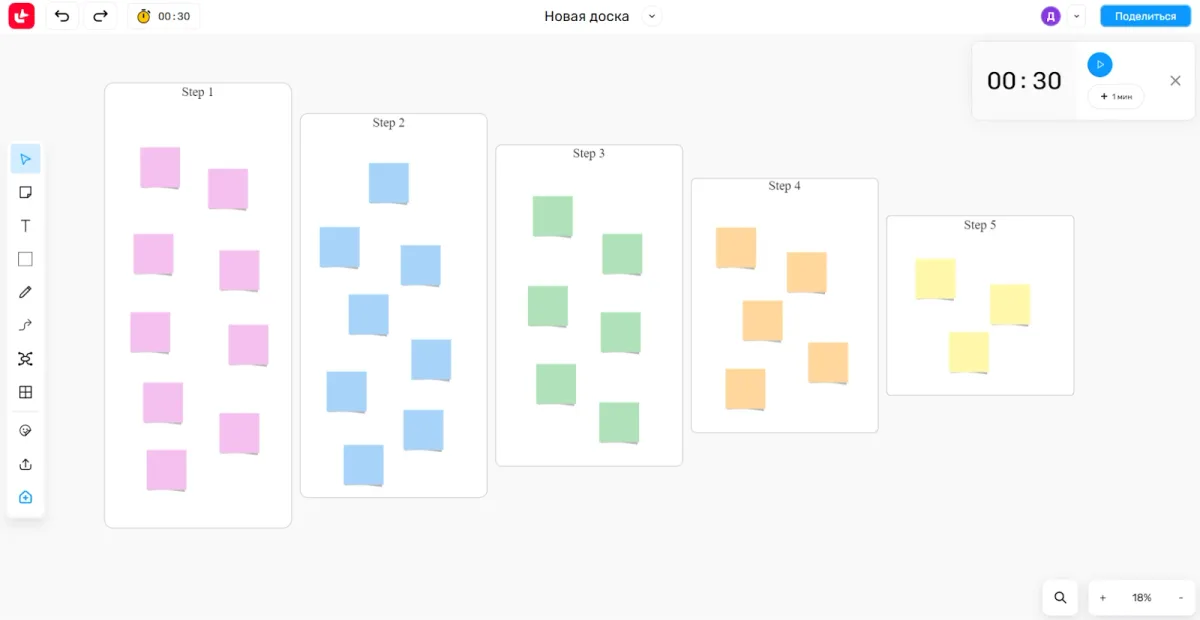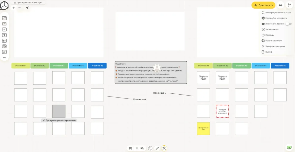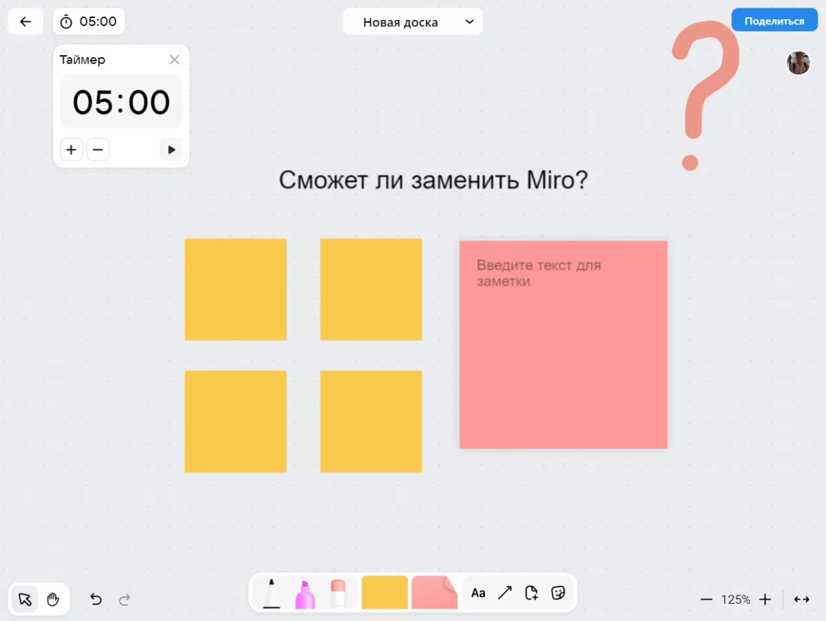 Сервис подходит для разных целей — от деловых встреч до учебных занятий. Вы можете создать столько досок, сколько нужно, и пригласить любое количество участников. Удобные функции, вроде таймера, помогают эффективно организовать рабочий процесс.