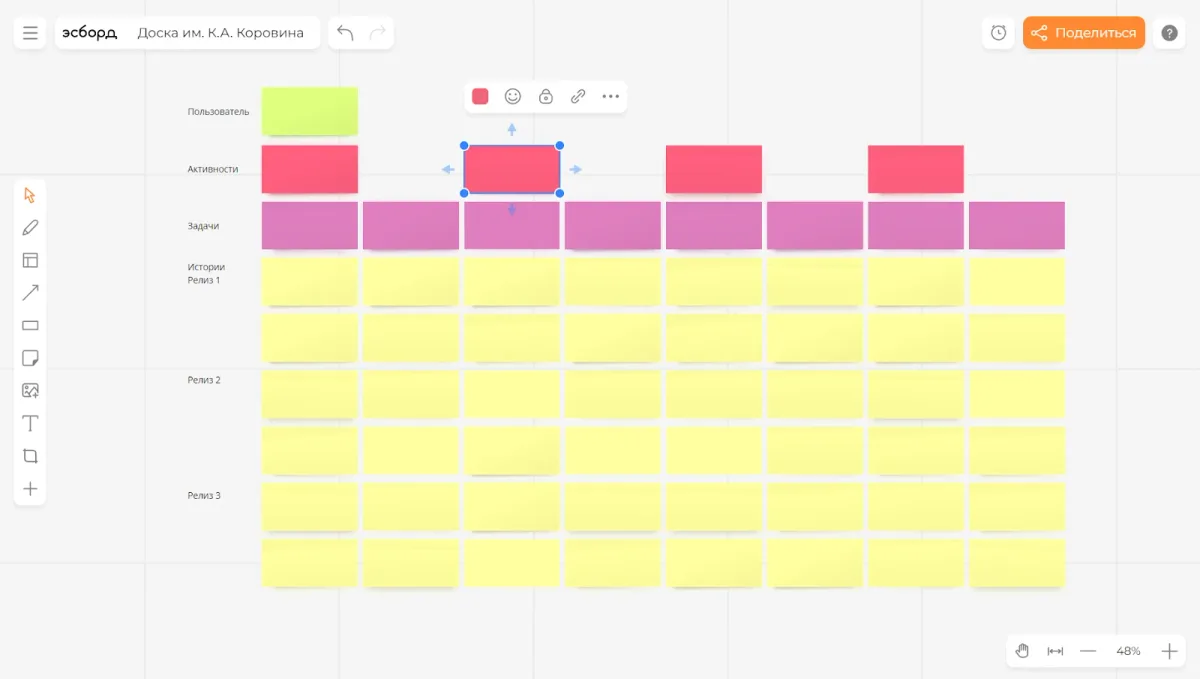 В Эсборд доступны разнообразные инструменты для работы с контентом: пользователи могут добавлять и редактировать текст, изображения, фигуры и линии, изменять их цвет и размеры. Сервис также поддерживает работу с фреймами и стикерами, что помогает структурировать информацию и упрощает навигацию по доске. Все изменения сохраняются автоматически, а взаимодействие с другими участниками происходит в реальном времени, что делает работу на доске более продуктивной.
