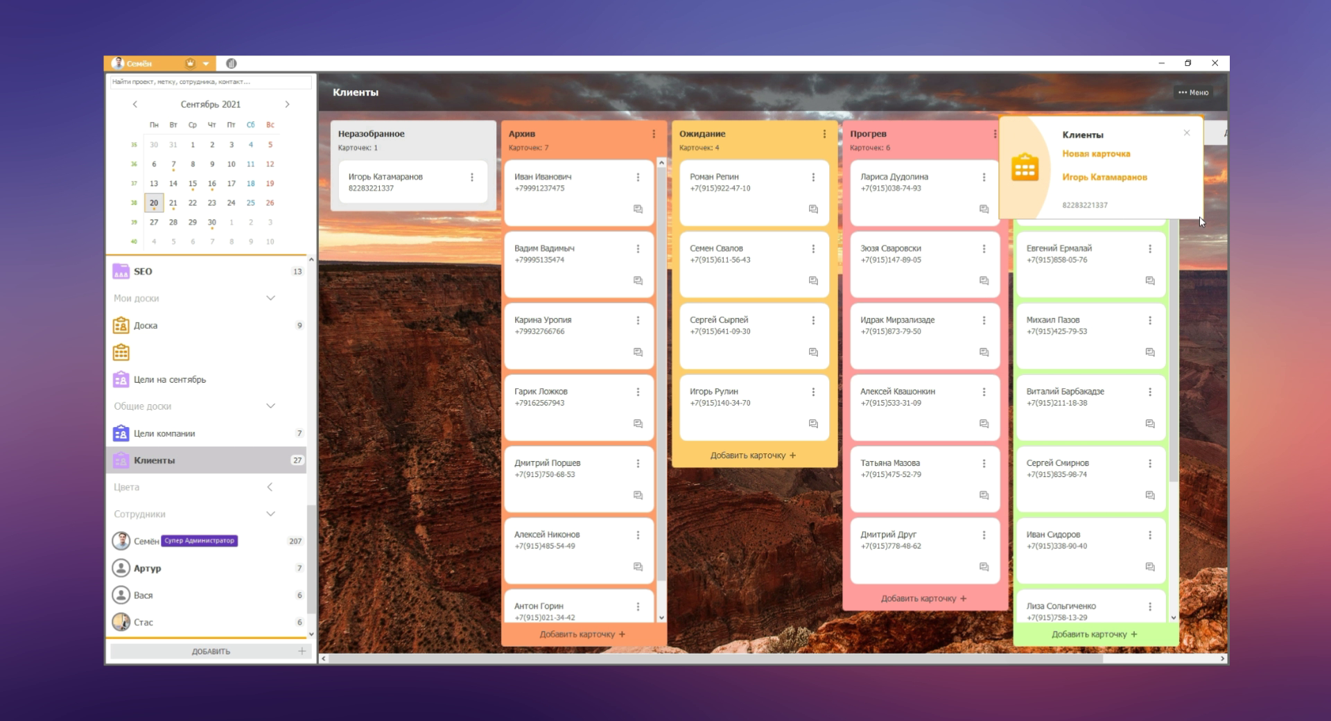 Доски в ЛидерТаске можно использовать для управления базой клиентов. Вы можете заполнять базу клиентов как вручную, так и автоматически с помощью формы сбора заявок.