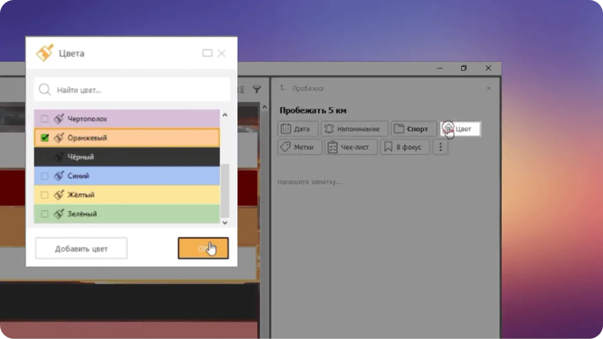 В ЛидерТаске есть возможность настроить сортировку и фильтрацию, как вам будет удобно. Для этого здесь используются метки и цвета. В свойствах задачи кликните по кнопке «Цвет» и выберите его из существующих или создайте собственный.
