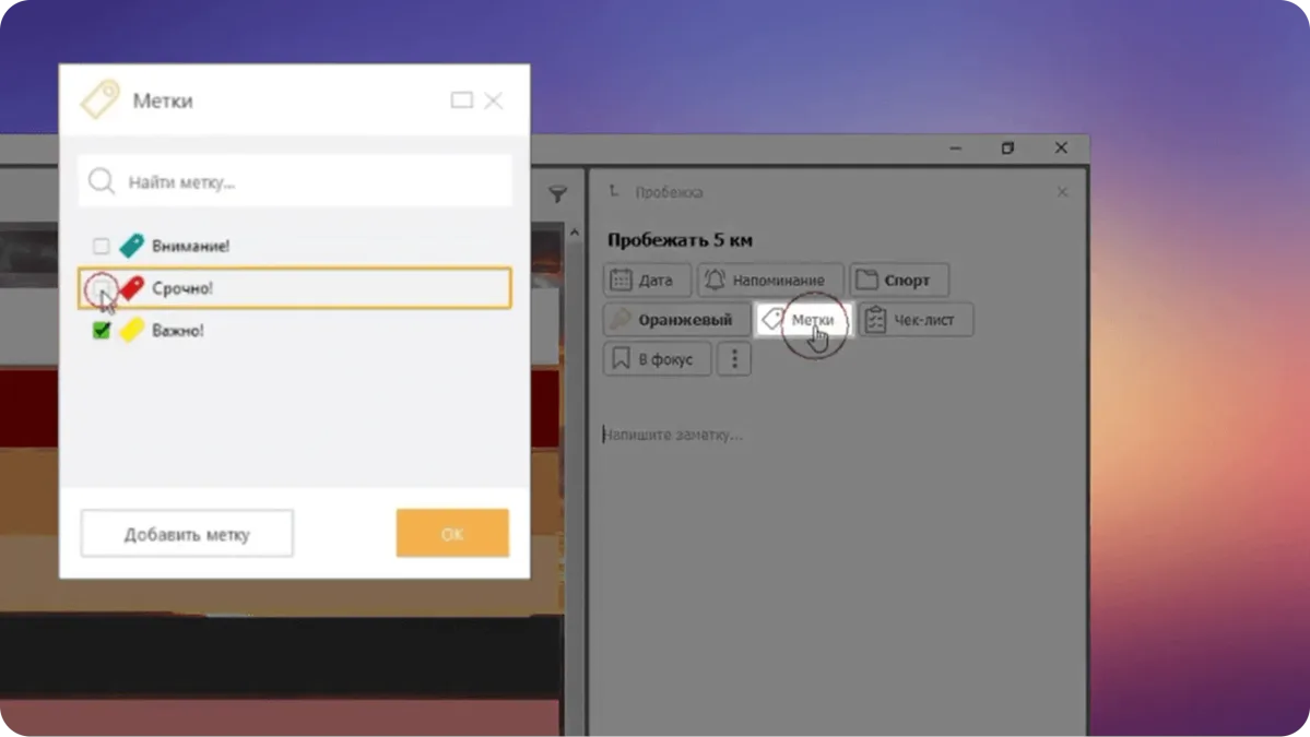 Задача окрасится в нужный цвет. Метки добавляются аналогичным образом: кнопка «Метки», выбрать одну или несколько. И цвета, и метки можно добавлять свои или выбирать существующие.
