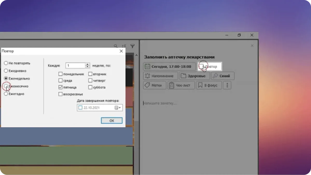 Чтобы одна задача повторялась с какой-либо периодичностью, нажмите на кнопку «повтор» в свойствах задачи и настройте периодичность.