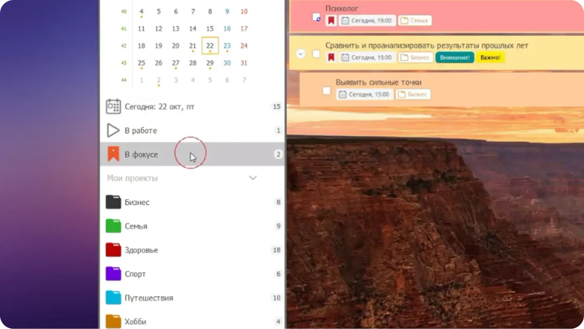 А ещё можно отправить важную задачу в фокус и она всегда будет перед глазами.