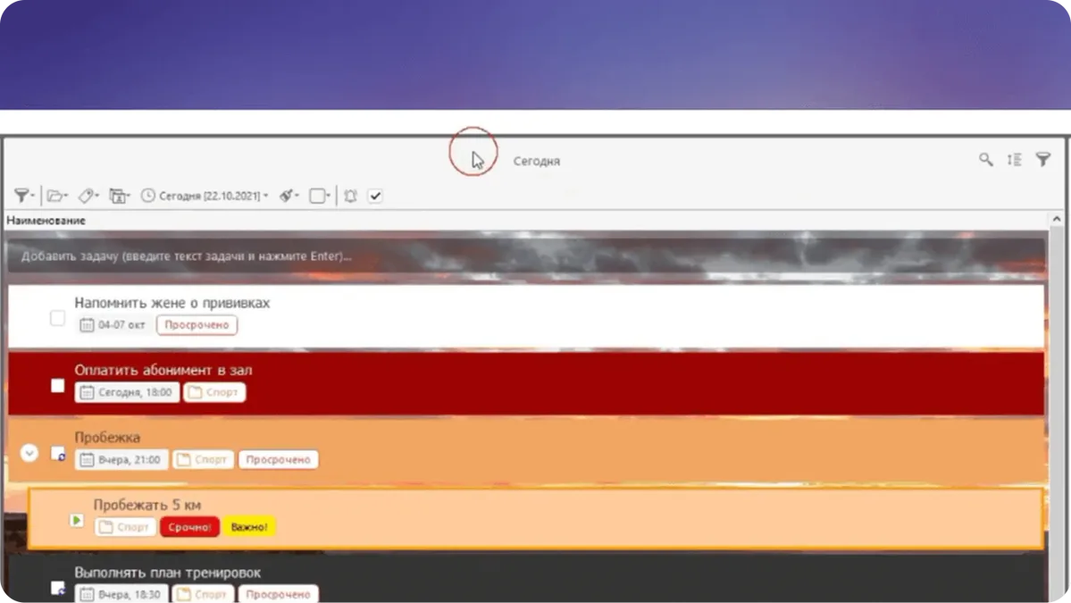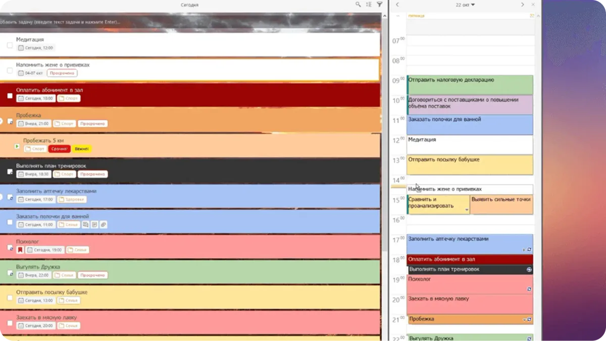 Допустим, нам нужны важные задачи на сегодня лилового цвета. Выбираем метку, день и цвет.