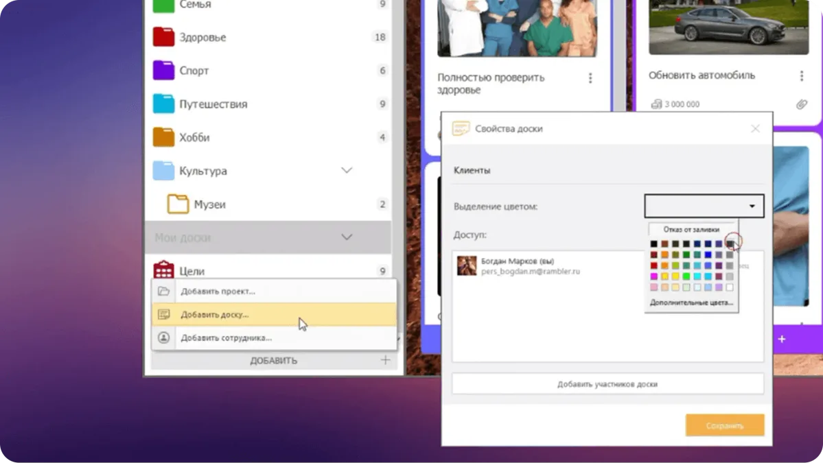 Чтобы создать доску, нажмите на кнопку «Добавить» в нижней части навигатора и выберите пункт «Добавить доску». Укажите наименование доски и выберите цвет.