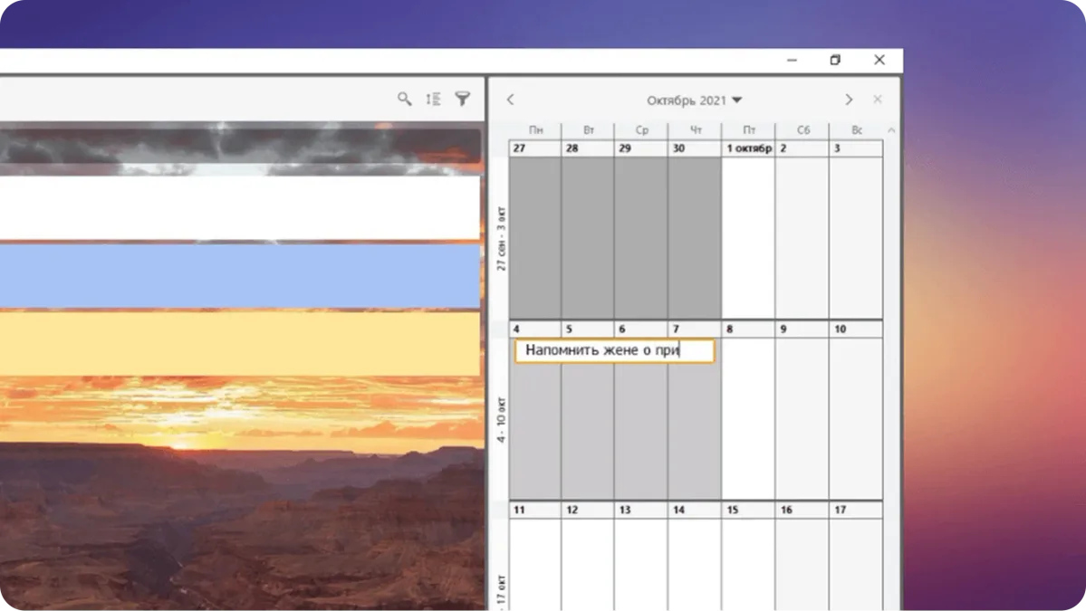 В правой части приложения располагается ежедневник, его удобно использовать для составления личного плана на день.