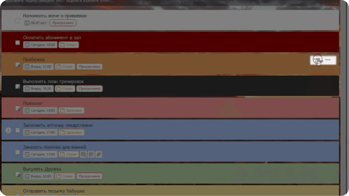 Задачи можно редактировать напрямую из ежедневника. Оранжевая линия наглядно покажет, сколько времени осталось на их исполнение.
