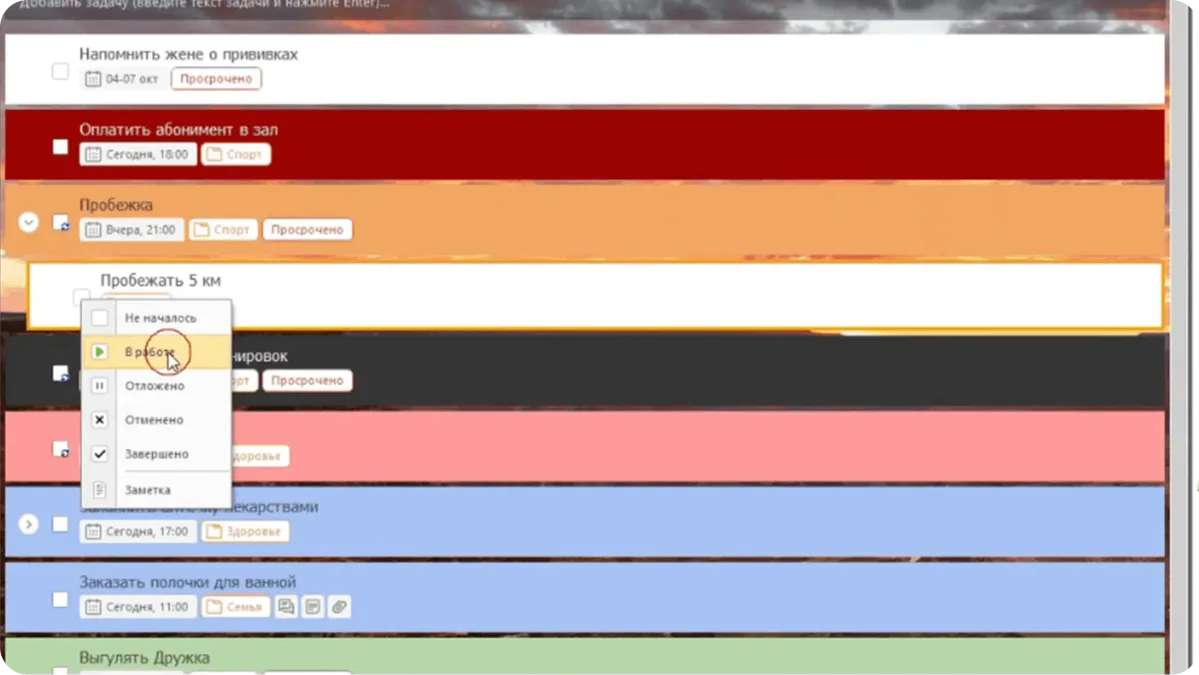 Статус задачи говорит нам о том, на каком этапе исполнения находится задача. Нажмите на это окошко в списке задач и выберите подходящий статус.